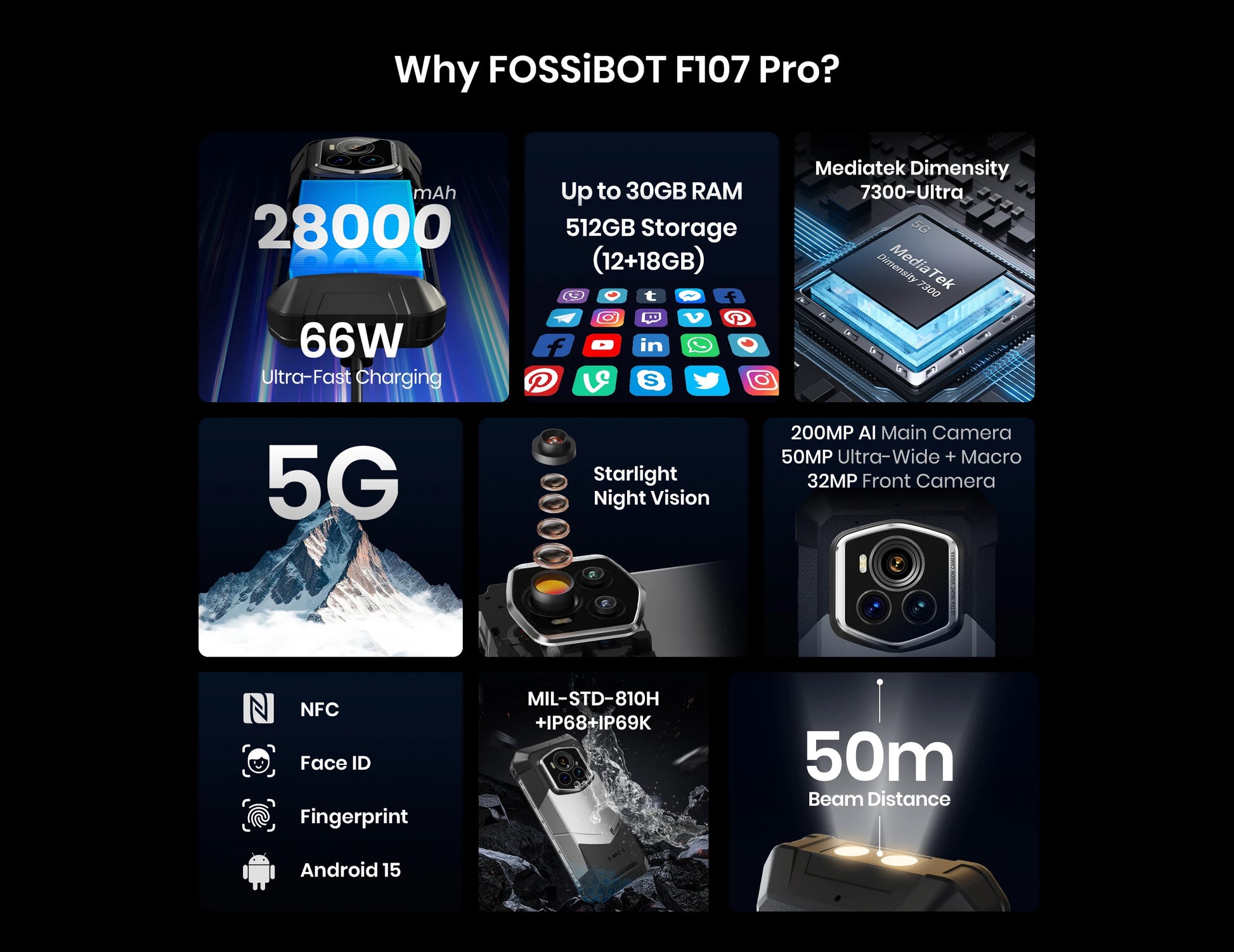 FOSSiBOT F107 PRO Rugged Smartphone Android 15 OS,30GB(12+18)+512GB ROM,6.95"FHD+ 5G Mobile Phone 28000mAh Battery,NFC/Face ID