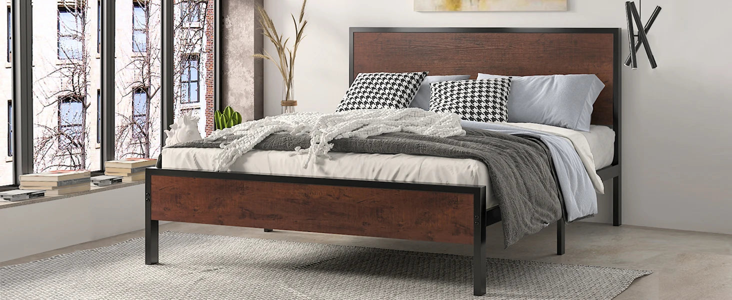 The combination of wooden panels and metal frame creates this unique shape. The rustic style bed frame fits any kind of room decor.