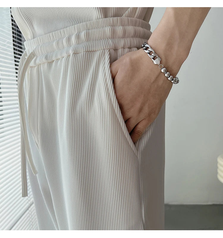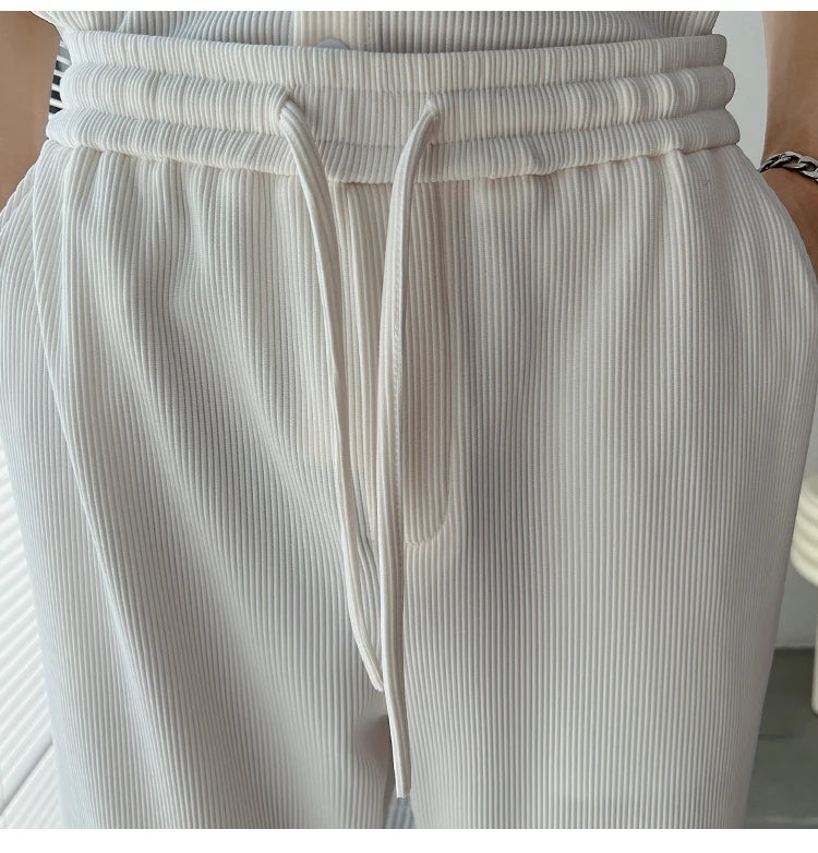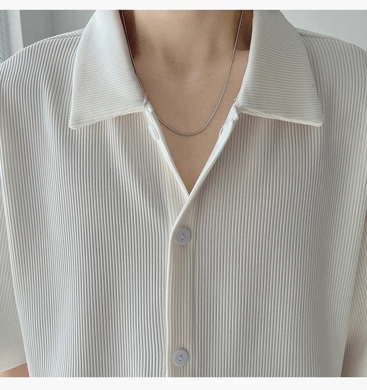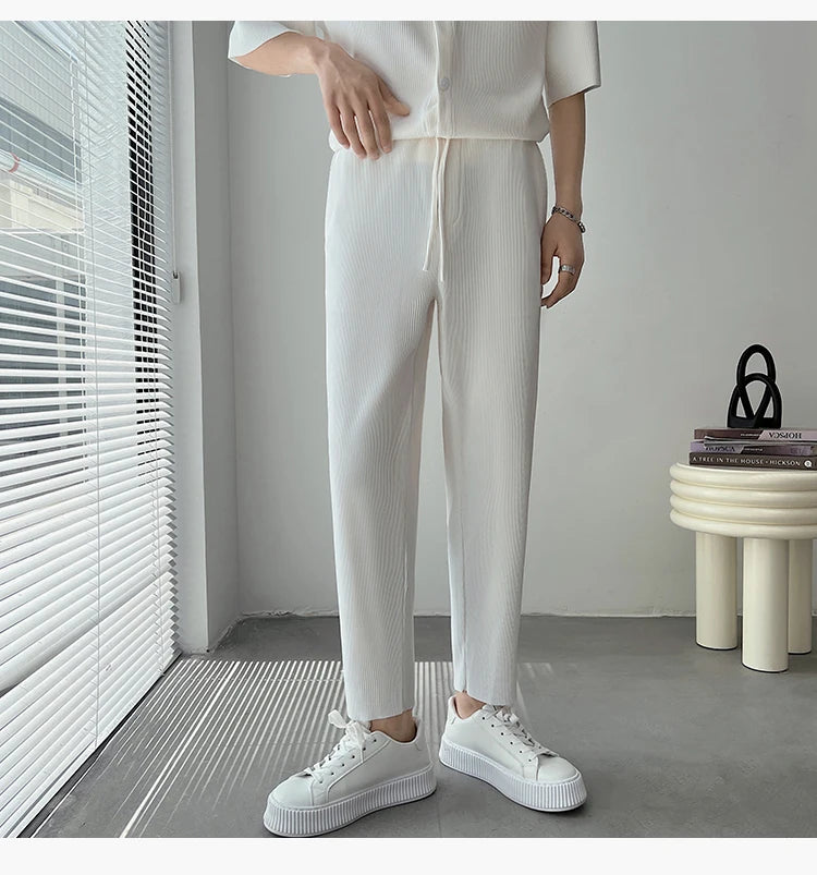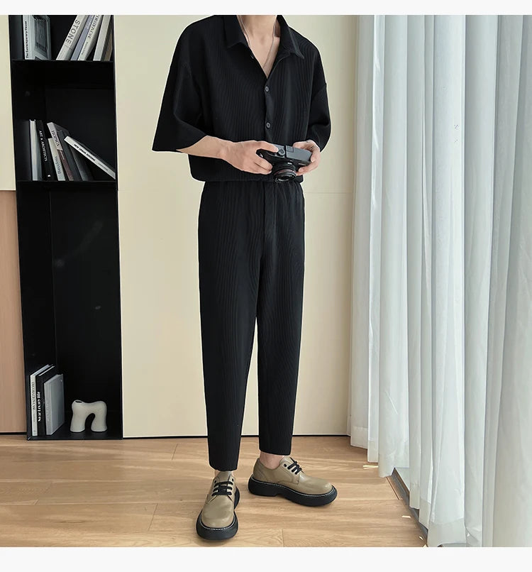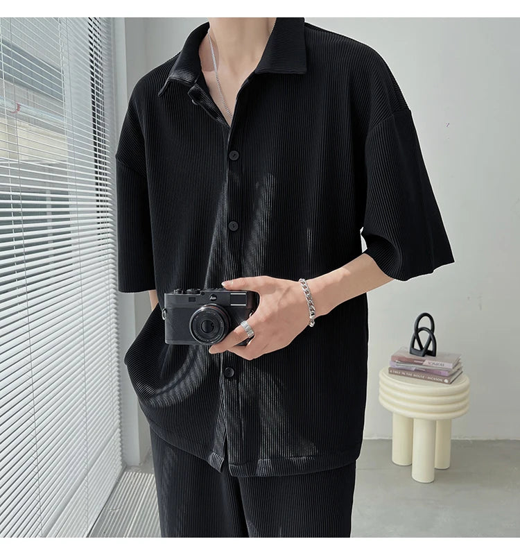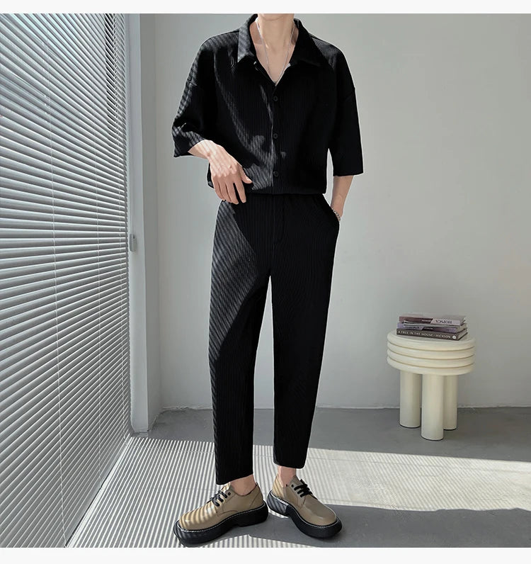 Summer Pleated Sets Men Fashion Black/White Casual Ice Silk Suit Men Korean Short-sleeved Shirt/Trousers Two-piece Mens Set